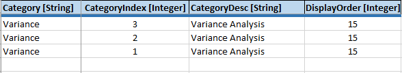 Click Import and select an .xlsx file. You can import to multiple categories at the same time. For example, in this file, the Variance category is being added to Category 1, Category 2, and Category 3.