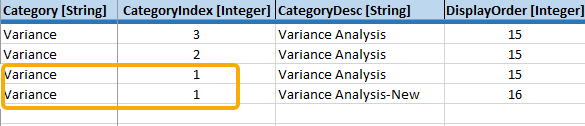 You cannot have duplicate names within a category index. For example, this file is attempting to create a category named Variance twice in the Category 1 index. This is not allowed.
