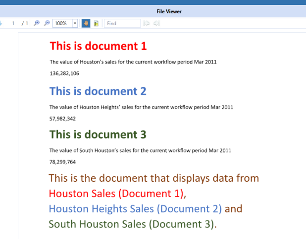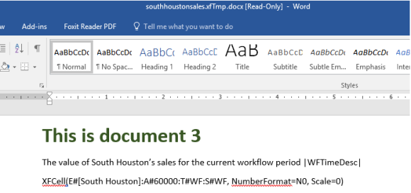 NOTE: Documents inserted into other documents must be saved with .xfDoc as part of the file name, for example SouthHoustonSales.xfDoc.docx for a Word document. Documents not stored in this format cannot be inserted in other documents
