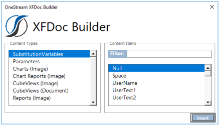Use the OneStream XFDoc Builder dialog box to insert components. Double-click the content types to add them to the list of content items, and then click Insert.