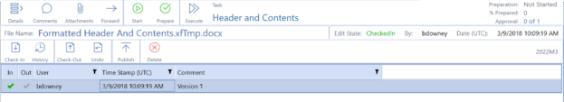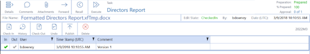 Click Open to check in the document. The document displays in the task, with a status of CheckedIn. The document displays a green check in the In column to indicate it is checked in.