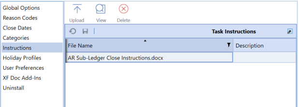Select a file to remove from the task instructions list, then click Delete to remove it from the list. This does not permanently delete the file, but removes the file name from the OneStream database.