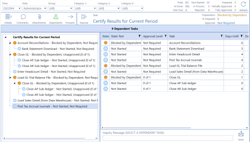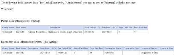 You can send an inquiry message directly from this page to the selected dependent task’s Preparer. This lets you easily collaborate and share information about the task. To send an inquiry message, select the task, then enter your message in the Inquiry field. Click Send to send the message to the task Preparer. The assigned Preparer and Preparer group will receive a detailed task status inquiry email.