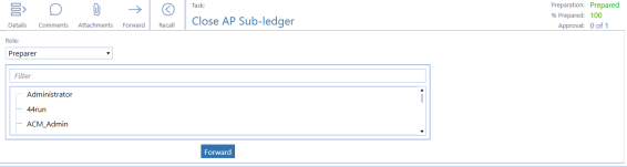 This icon displays if you have permission to forward the selected task. Forward lets Preparers and Approvers reassign task instance ownership to a different Preparer or Approver in the selected time period. Task forwarding does not change the task assignment for past or future time periods. Preparer Group and Approver Group assignments are retained.