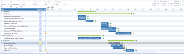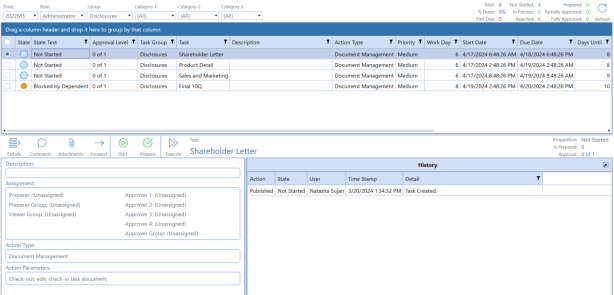 The preceding example shows the original task Disclosures executed, and the dependent task Shareholder Letter is selected from the Gantt view to display in the page. You can also see any cascading dependent tasks on the same page.