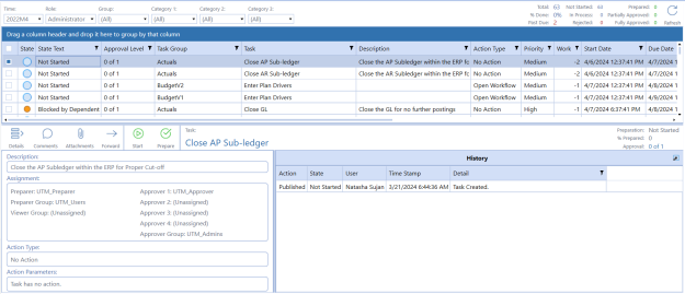 Selecting this provides task details such as assignment by preparers, approvers, and preparer, approver, and viewer groups, action type, action parameters, and history.